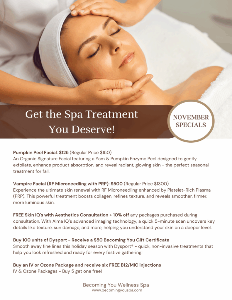 Home Visit Visit Us! Our Staff Contact Us Current Specials Face Alma Skin IQ Facials/HydraFacials EMFACE® EXION™ FACE EXION™ Fractional RF Microneedling IPL/Photofacial Waxing/Hair Removal Dysport/Botox PRP Facial Body EMSCULPT NEO® EXION™ BODY Laser Hair Removal EMFEMME® 360 EMSELLA® Waxing/Hair Removal InBody Hair Restoration Alma TED Keravive Hair Restoration Nutrafol Holistic Therapies IV Therapy Hormone Pellet Therapy PRP Joint Injections Functional Emsculpt Neo Cupping FSM BioMat Sauna Shop Be Well Family Care Menu Home Visit Visit Us! Our Staff Contact Us Current Specials Face Alma Skin IQ Facials/HydraFacials EMFACE® EXION™ FACE EXION™ Fractional RF Microneedling IPL/Photofacial Waxing/Hair Removal Dysport/Botox PRP Facial Body EMSCULPT NEO® EXION™ BODY Laser Hair Removal EMFEMME® 360 EMSELLA® Waxing/Hair Removal InBody Hair Restoration Alma TED Keravive Hair Restoration Nutrafol Holistic Therapies IV Therapy Hormone Pellet Therapy PRP Joint Injections Functional Emsculpt Neo Cupping FSM BioMat Sauna Shop Be Well Family Care Check out our Monthly Specials!Give us a call to purchase one of our Specials!317.938.4559